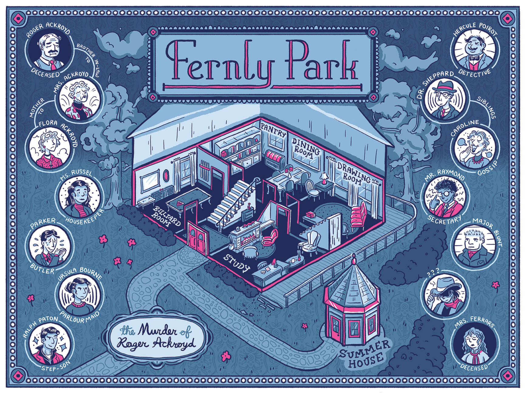 Fernly Park, Ackroyd's home estate, is the main setting for the mystery. This map showcases the first floor, with the room placement and Study furniture layout mirroring rudimentary maps featured in most printings of the novel. Additionally included are portraits of my interpretations of the main cast.