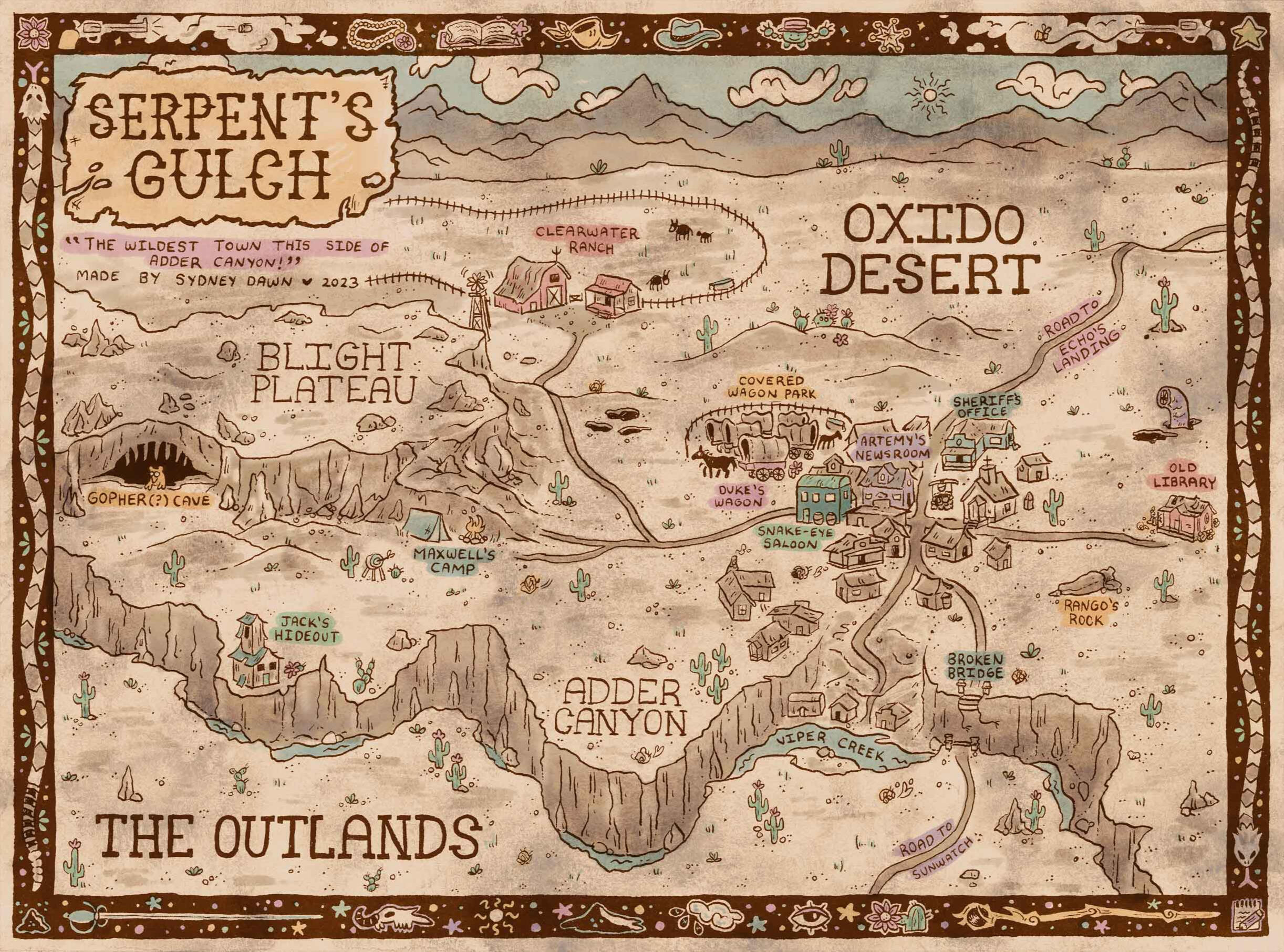 A map of a magical wild west town, created for a TTRPG (Monster of the Week) campaign I ran for my friends. The linework was done with a dip pen, which I then scanned and rendered digitally.