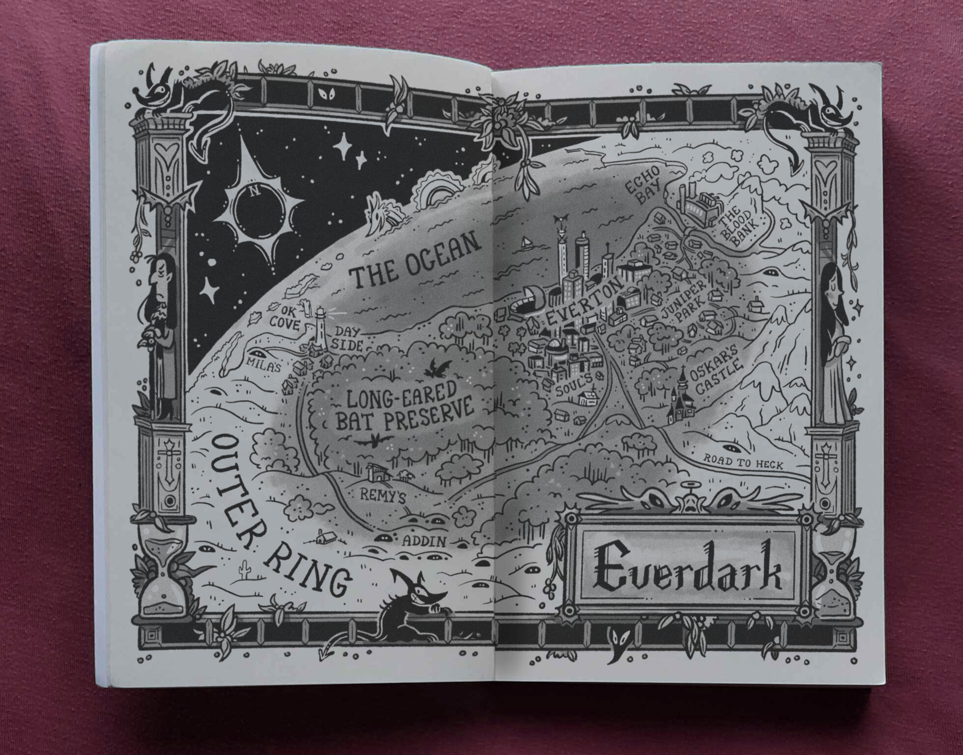 An interior map for a hypothetical YA fantasy:"After an unfortunate series of asteroid strikes, the spin of the planet Terra synced with the Sun, creating hemispheres of permanent day and night. This sucked fang for everyone involved—except for the Vampires of Everdark, the ghoulish fiends who thrive in the eternal eclipse beneath the Moon."