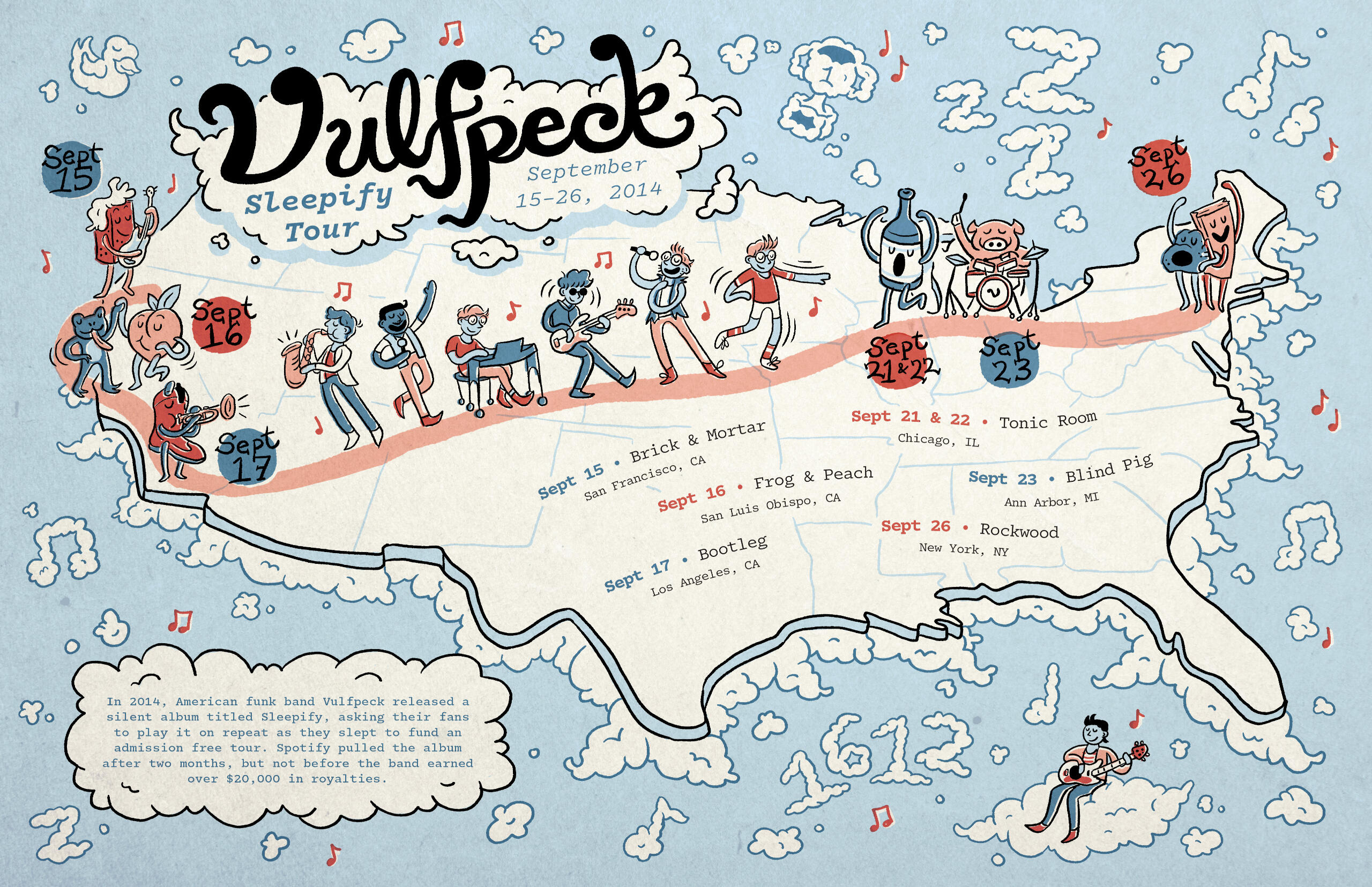 A fan-made map of Vulfpeck's 2014 Sleepify Tour.