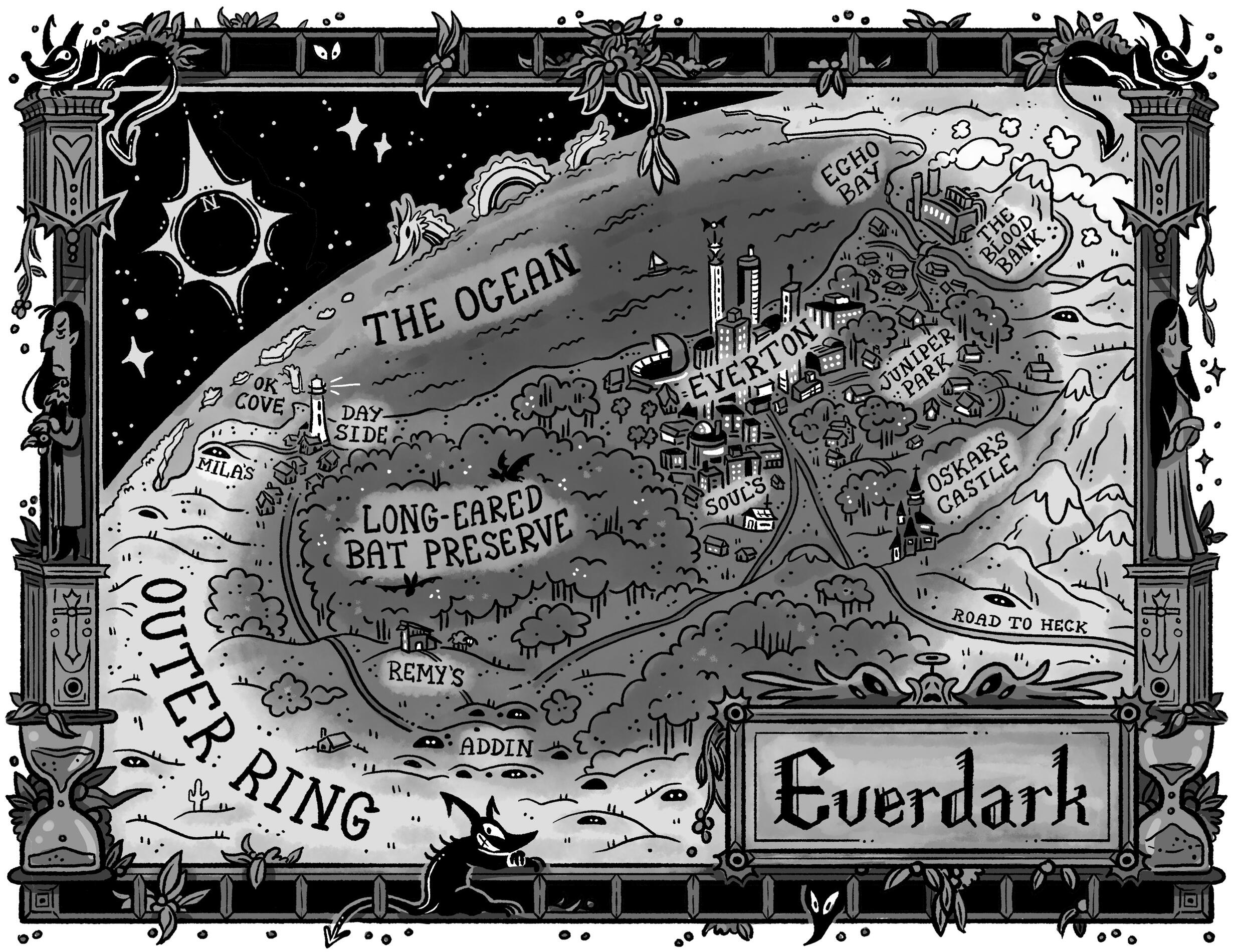 An interior map for a hypothetical YA fantasy:"After an unfortunate series of asteroid strikes, the spin of the planet Terra synced with the Sun, creating hemispheres of permanent day and night. This sucked fang for everyone involved—except for the Vampires of Everdark, the ghoulish fiends who thrive in the eternal eclipse beneath the Moon."